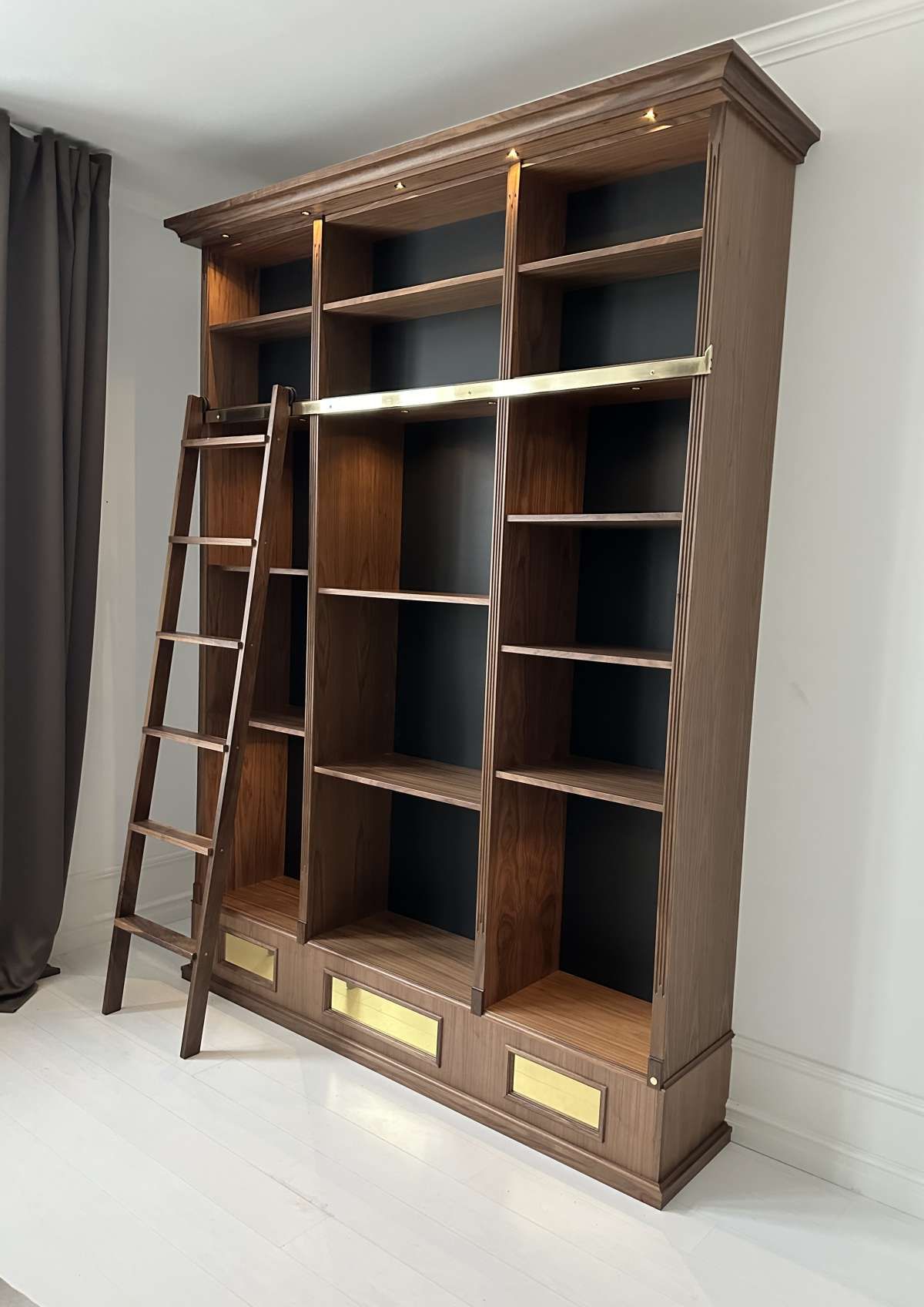 Bokhylla i valnöt med mässingdetaljer.