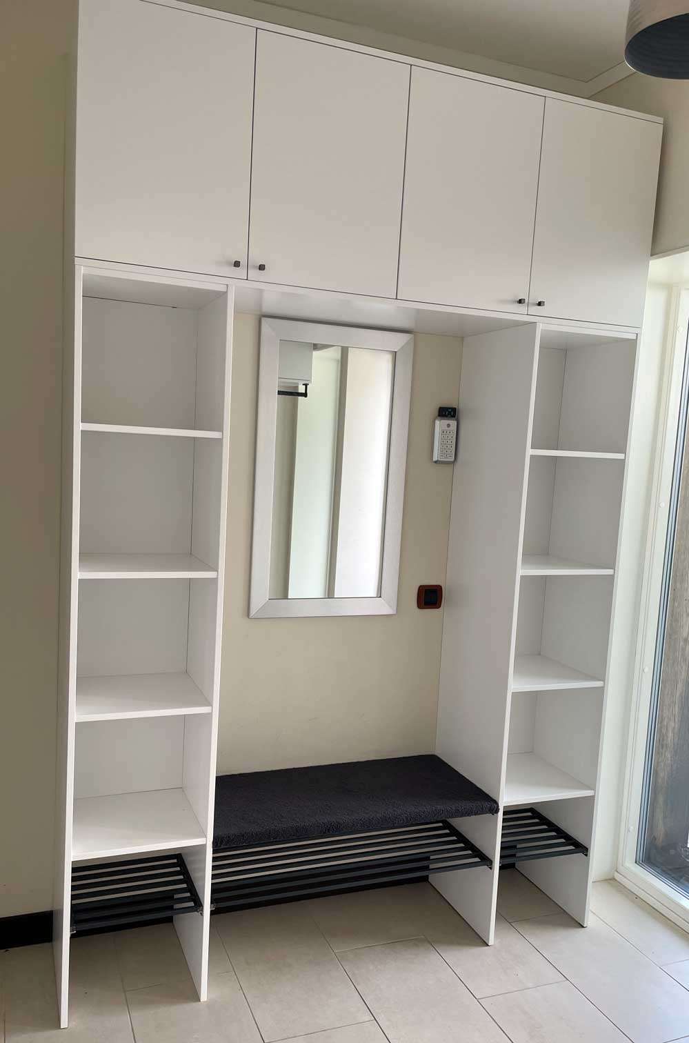 En garderob som utnyttjar hela väggen. Praktiska lådor längst ner underlättar.